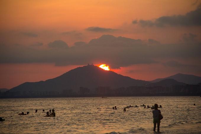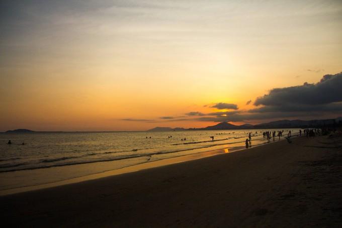 (上图)这里是三亚湾。从亚龙湾回来,因为李和思密达在三亚湾拍照,所以我和苗就来这边找他们。李算好了时间,为了就是抓拍一张夕阳的照片,可惜的是,正当太阳下落的时候,有一团云把太阳挡住了。漫步在海边,情人嬉戏,小孩热闹,畅聊生活点滴,不胜惬意。
