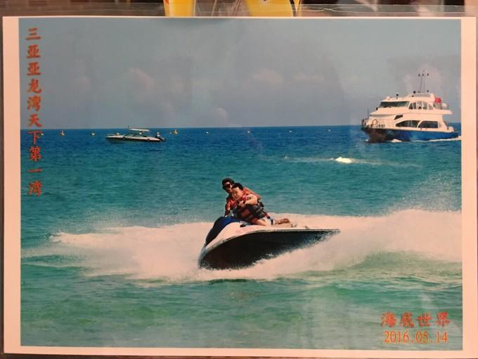 (上图)摩托艇。本想问下妹子想玩啥,妹子什么都不想玩,按照以前的想法,可能朋友不玩,我也不会玩,但是想明白,自己开心还是很重要的,所以去玩了摩托艇,妹子答应说在旁边给我拍照。可等我在大海中转了一圈回来的时候,妹子就不见了,有个人喊我可以看看刚才他们给我抓拍的照片,20元一张,选中这一张,可我没钱啊,钱包妹子拿着,没办法,只能一个劲的找啊找,还好,找了蛮久还是找到了,期间,我还回那个取照片的地方,叫他多等一下,怕等太久以为我不要了,还好。