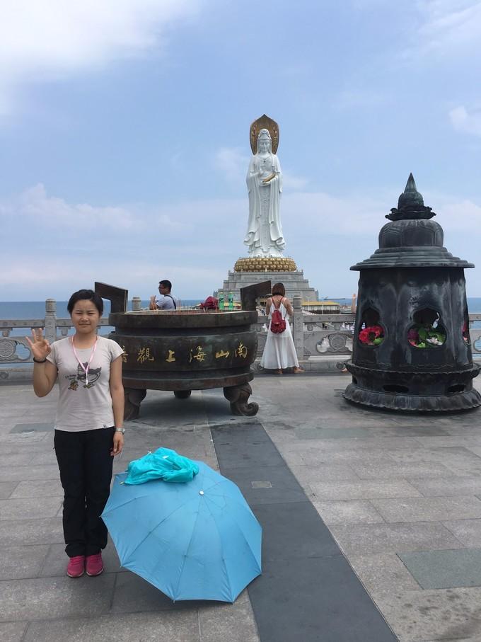 (上图)海上观音。这个总投资8亿建造的高观音像很是引人注目。导游之前说,不能站在正中去拍摄佛像,不好意思。因为我们三个没有很好的分配时间,以致于我们没有时间更近距离的去看一下观音像。印象是导游说,不管从哪个地方看观音,都是正面,原因吗,只是他的头像设了好几面。这个只是正面头像。
