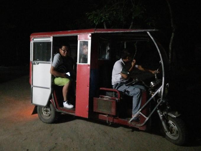 (上图)我们准备去吃文昌鸡。文昌鸡可是在全国相当有名啊。我们打电话给饭店的老板,让他们来接。本来小史叫了一辆,我们也叫了一辆,看见一辆车勉强能装下我们6个,省点钱,一起出发吧。车在乡间小路上行驶,速度蛮快,好几次差点被甩出去,幸好抓扶手抓的紧。
