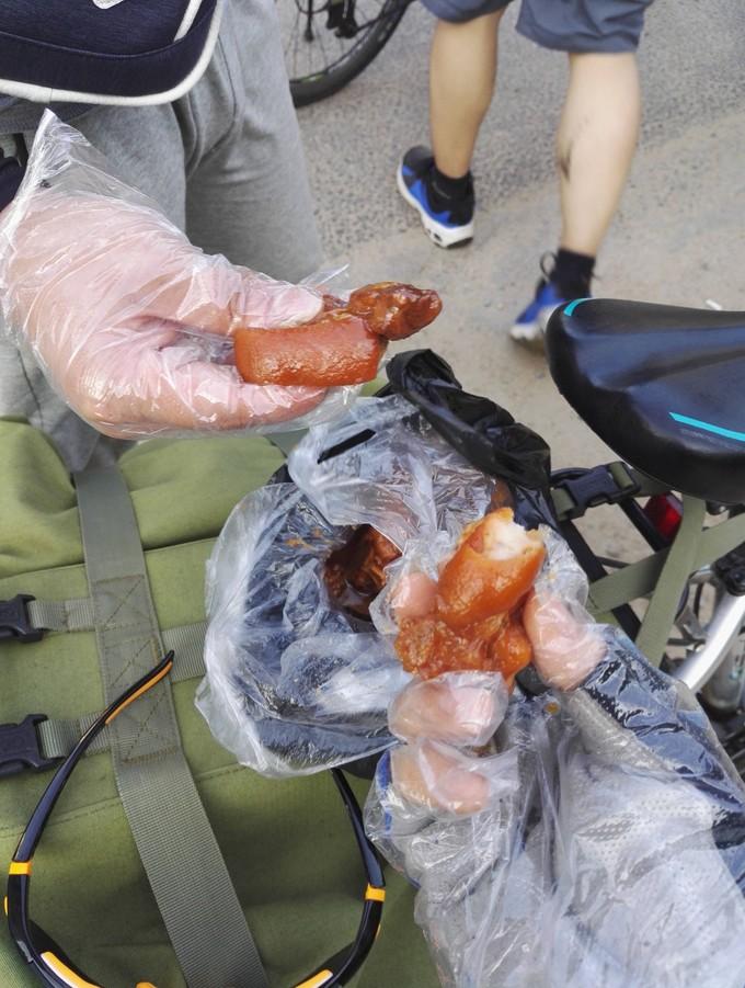 阳光强烈,气温较高,运动量大,蒸发旺盛,必须不断补充水分。我每天骑行8个小时以上,喝水500ml的至少5瓶,但途中基本没有“唱歌”的冲动。脱水中暑的后果是严重的。除了早餐吃饱晚餐吃好,路上也需要不停地进食补充能量,饼干、沙琪玛、蛋黄派都是不错的选择。不过饼干本身很干,估计在很渴的情况下没啥欲望。
