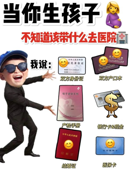 夫妻双方身份证+社保卡+产检资料+建档卡+生育服务单及其复印件+现金