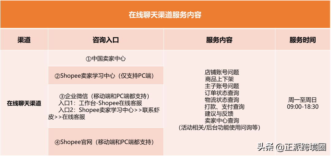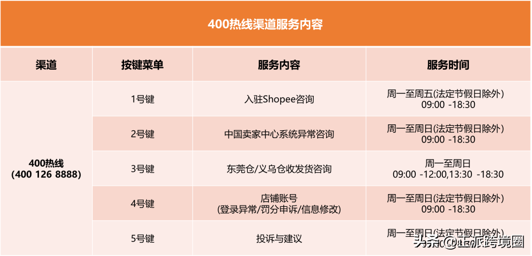 据Shopee消息,为了提升各位卖家的服务体验,提高沟通率,自2022年7月25日起,Shopee中国跨境卖家支持团队对400热线&在线聊天渠道承接的服务内容做出相关优化调整,新渠道服务内容如下: