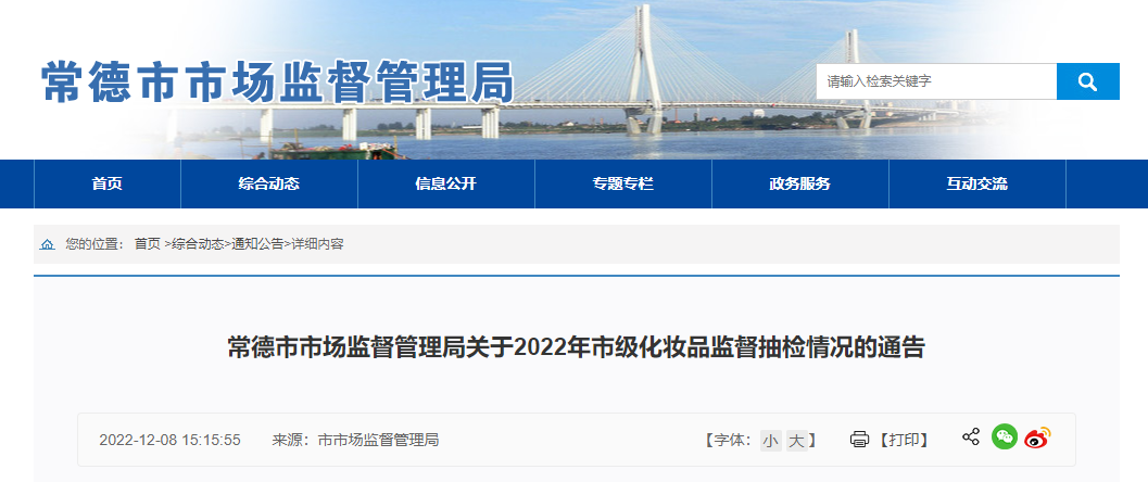 中国质量新闻网讯 12月8日,湖南省常德市市场监督管理局发布2022年市级化妆品监督抽检情况。为保障公众用妆,根据《化妆品监督管理条例》相关规定和常德市市级化妆品监督抽检工作计划,2022年该局对全市辖区内化妆品经营单位20批次的化妆品进行了抽检,检验结果全部符合规定。