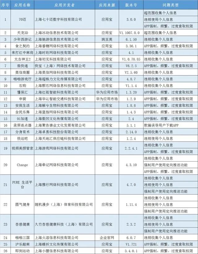 上海:51款APP侵害用户权益被通报,微快递、天龙3D等26款尚未完成整改