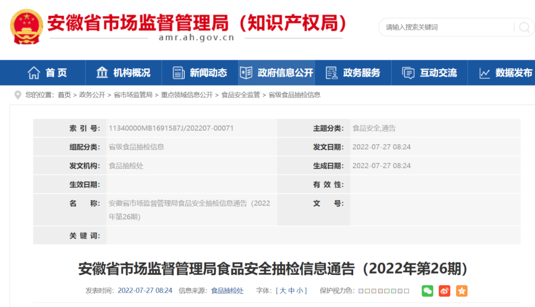 近期,安徽省市场监管局组织抽检6类食品352批次样品,检出不合格样品11批次。不合格样品涉及:标称合肥瑶海区红方炒货厂生产的葵花籽、标称合肥市瑶海区昕蕾炒货食品厂生产的油炸花生米、标称福建省龙海市玛利特食品有限公司生产的美国青豆(烧烤味)、标称铜陵九曲口商贸有限公司生产的红薯淀粉(分装)、标称安庆市怀宁县洪铺镇中焰食品厂生产的步步糕、标称安庆市怀宁县阳宁食品厂生产的怀宁贡糕等。