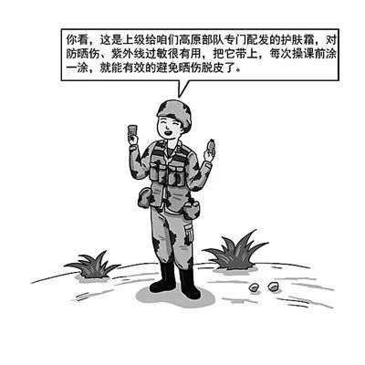“那必须的,这就像给皮肤加了保护层,应对紫外线还是有用的。”看着大家晒得发红的皮肤,王排长觉得应和大家好好聊一聊了,虽说大家在驻训时不叫苦、不喊累,却不知道保护自己,好多同志胳膊上的皮都裂开了。