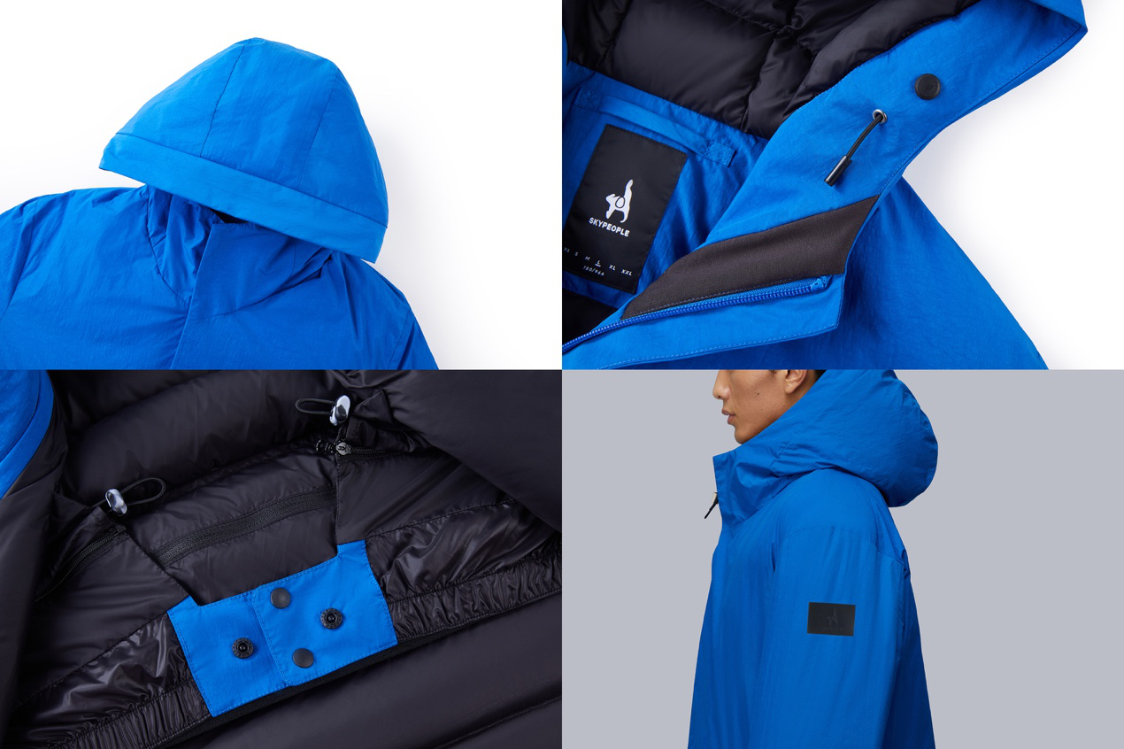 从职业人士通勤和差旅的需求出发,SKYPEOPLE在羽绒服的设计中都植入巧思。一方面是考虑到脖颈、腰部、袖处等极易灌风,防风袖、Warm-bar充绒系统、双层风雨帽等设计应运而生,让职场人士在通勤、差旅途中不惧风雪。