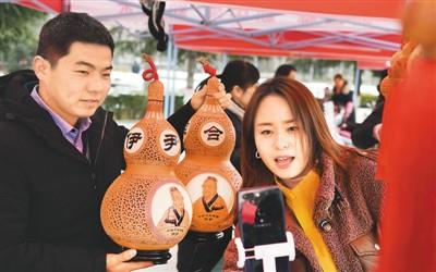 近年来,陕西省渭南市合阳县将电子商务作为县域经济转型的新动力,先后举办电商欢乐购物节、电商农产品展销会等系列活动。图为电商平台工作人员在合阳县“电商赶大集”活动现场直播推广葫芦灯。 新华社记者 陶 明摄