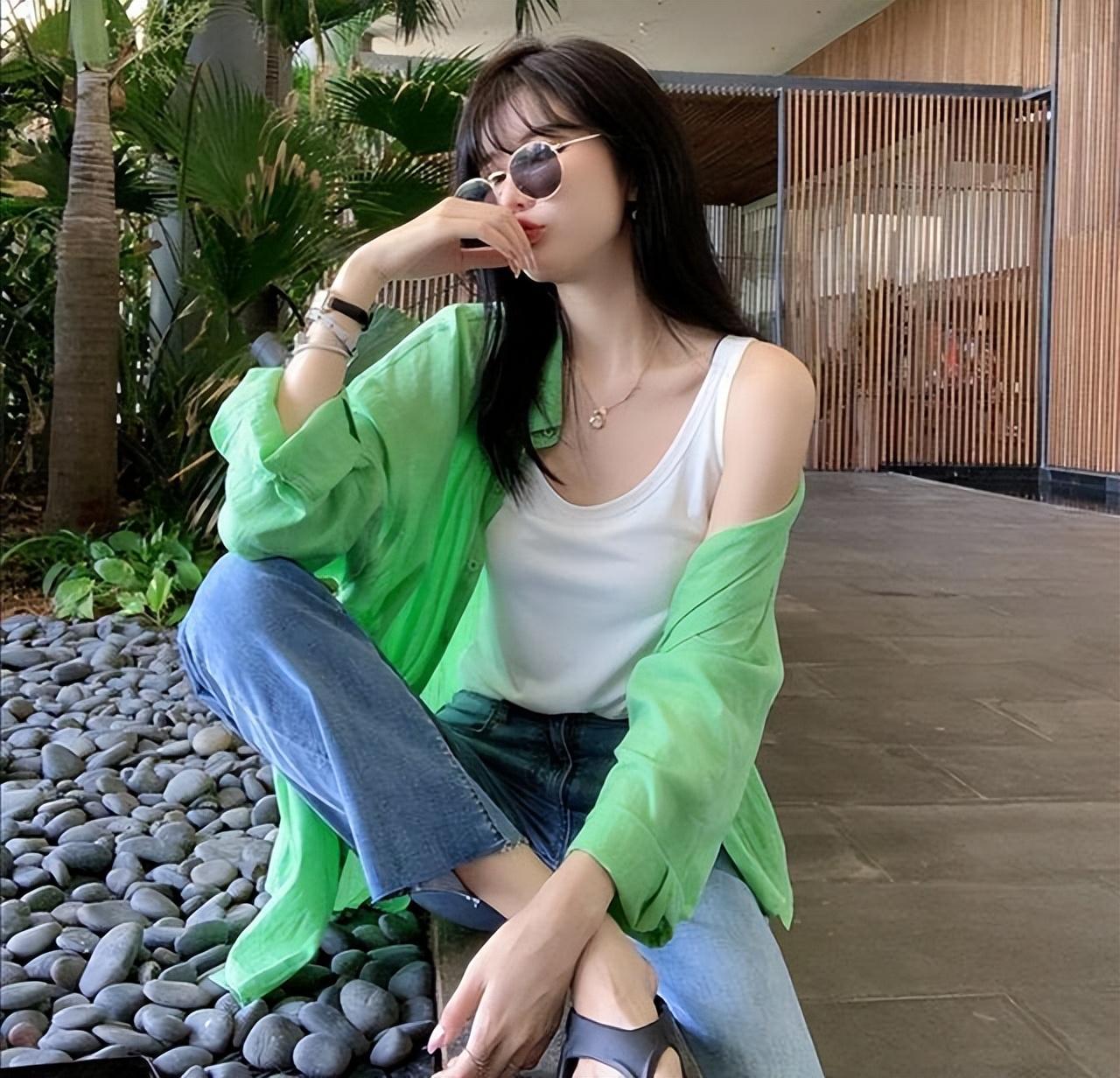 靓丽颜色的防晒衣可以搭配 一个白色的吊带,外加牛仔长裤的加持,青春朝气范十足了,出街就是靓丽的仔。