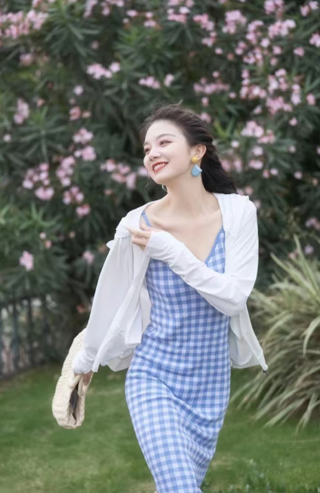 防晒和裙子搭配也是绝绝子,格纹的蓝色裙子配上白色的防晒,真的的好看了,是不是很具有夏天气息。