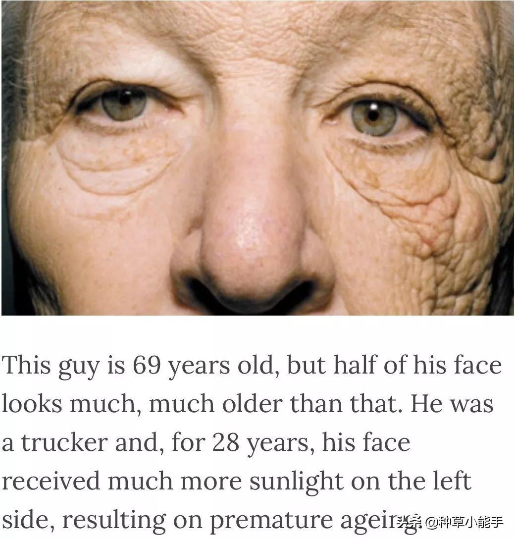 “上图这个人69岁,因为当了28年的卡车司机,他的左脸接受了更多的日照,导致过早衰老。”