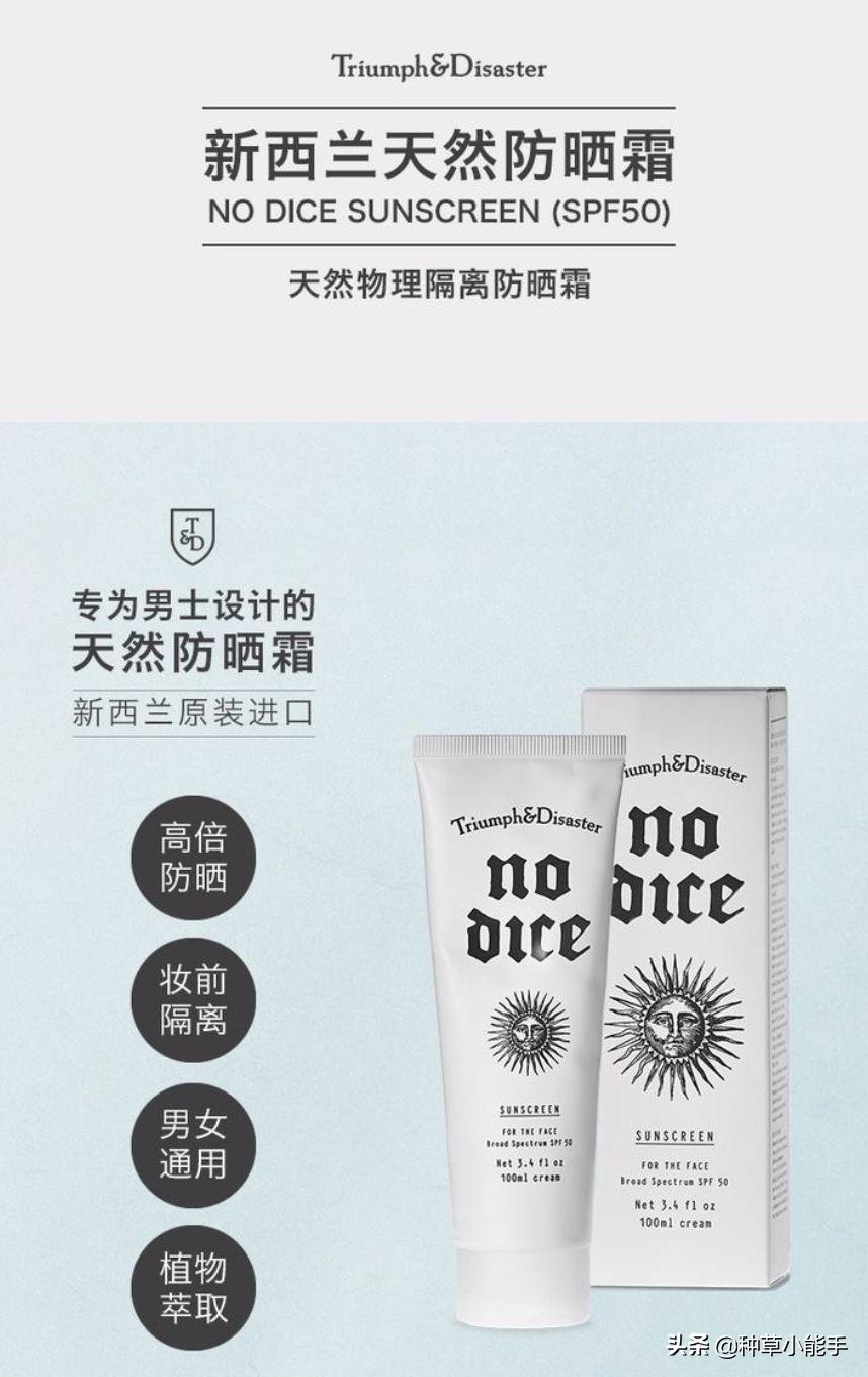 Triumph & Disaste独特的防晒配方,一方面有着高的物理防晒成份,另一方面有多种滋润肌肤的自然萃取物,使得No Dice不仅仅作为一款好用的防晒霜,还被用作肌肤隔离霜,作为日常肌肤护理,以及妆前打底使用。(男女可用)