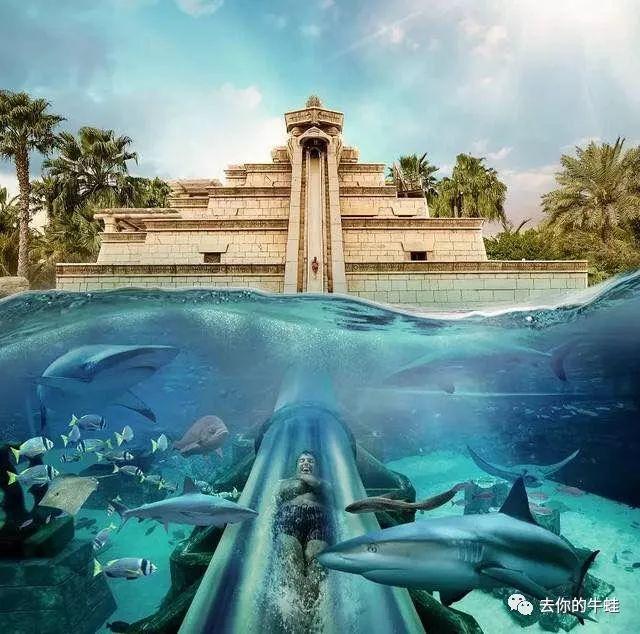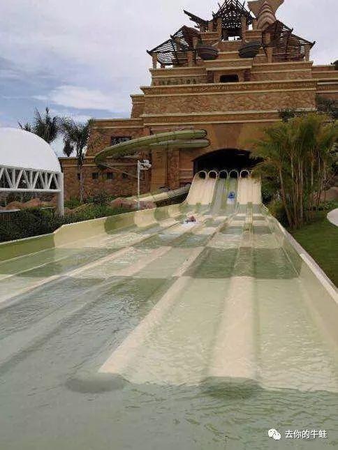 这个名叫“海神之跃”的滑梯是他们家的招牌,从25米高的塔顶直冲入海底鲨鱼池,体验自由式落体的刺激,全程总共1秒多,刺激吧?!嘿嘿,这是官方照,因为本人全家无人敢尝试……这个梯在我看来接近垂直,没有90度也有80度吧!