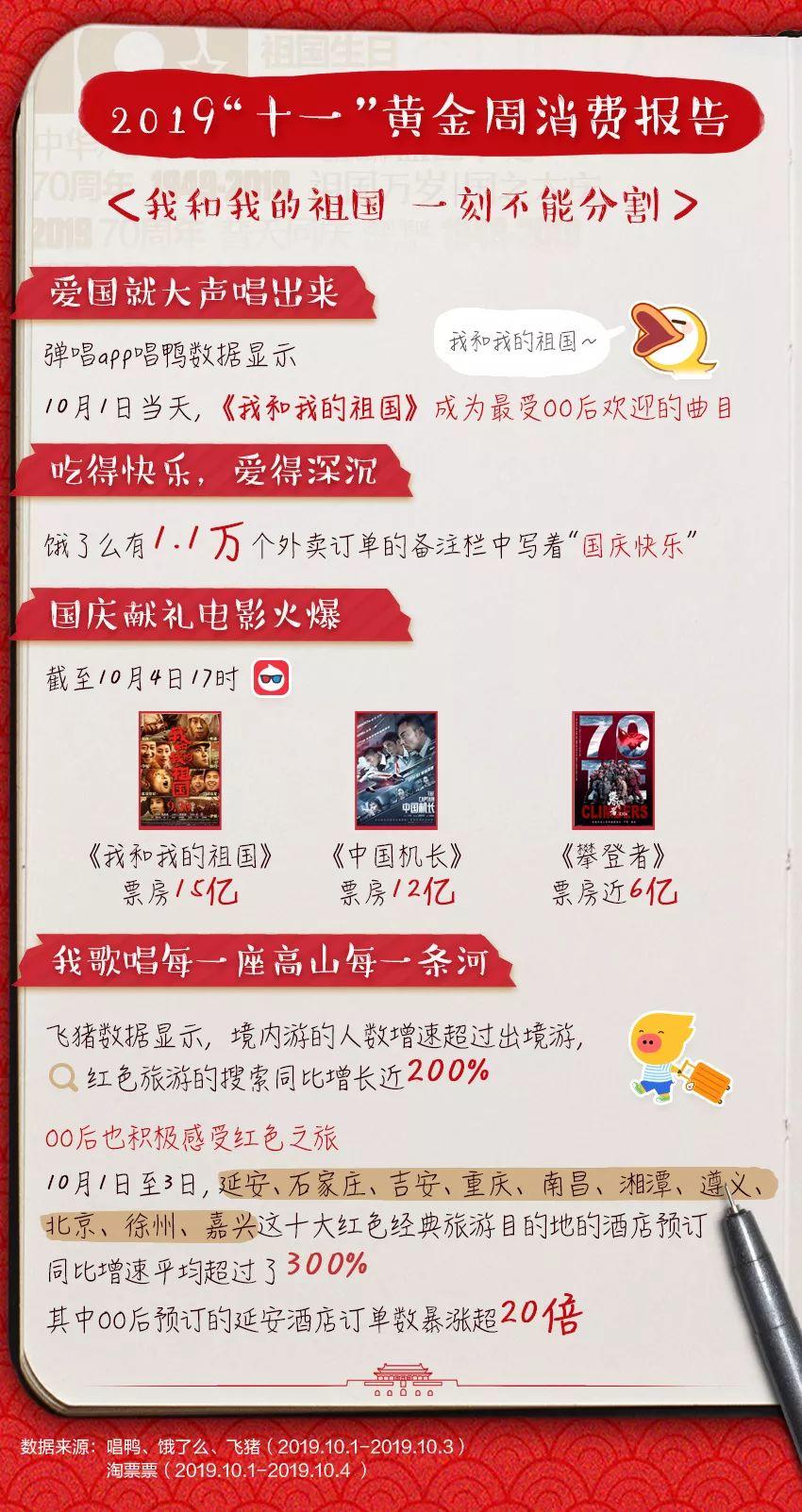 爱国就大声说出来。弹唱app唱鸭数据显示,1日当天,歌曲《我和我的祖国》成为00后受欢迎的曲目。国庆献礼影片《我和我的祖国》《中国机长》《攀登者》成为票房前三名,截至4日17时,累计票房分别为15亿元、12亿元、近6亿元。1日至3日,全国一共有1.1万份饿了么订单备注“国庆快乐”。