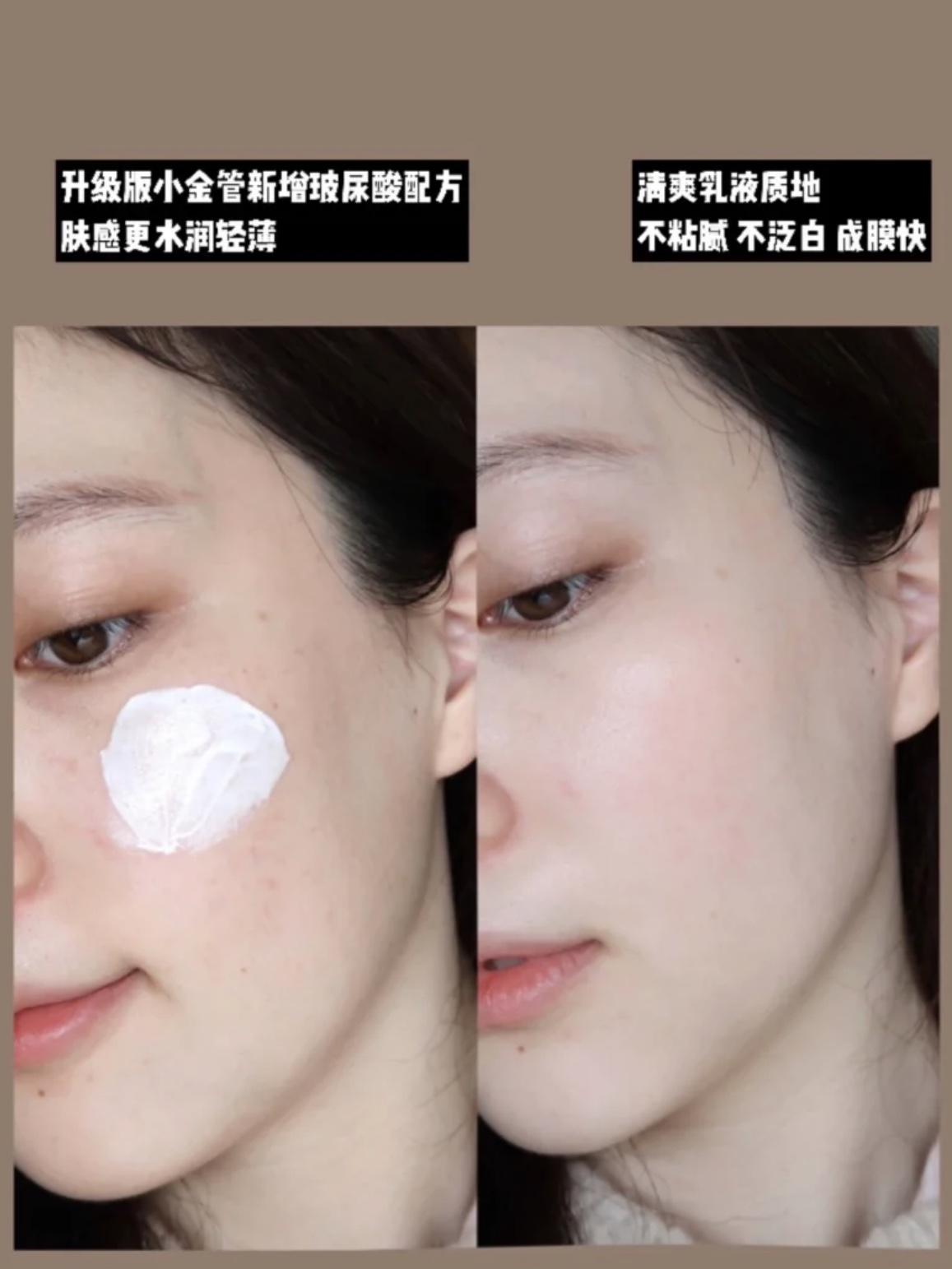 对于干皮来说,防晒霜的使用感一定是滋润的同时质地要清爽,即使后续上妆也不会搓泥或干皮。而这款小金管里面添加了玻尿酸、乳木果油等养肤成分,让它的质地更像是润肤乳,防晒的同时进一步提升了肤感,不干不搓泥还不会觉得很黏腻,而且上脸也不会觉得假白。