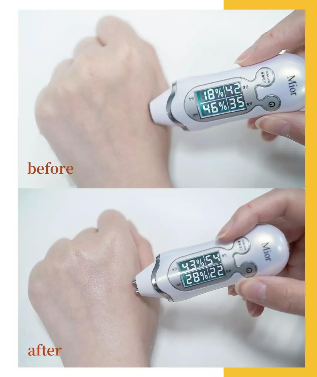 从2016年到2020年,小金瓶不断在改良配方升级技术,防水防汗防水的功真的是越战越强,但是让人惊喜的是原本都因为旧版本的油腻感弃用的小伙伴们,用完新版本之后都说,清爽的!可以看到使用前后,皮肤的含水量有大幅度的提升,就连含油量也下降 了。