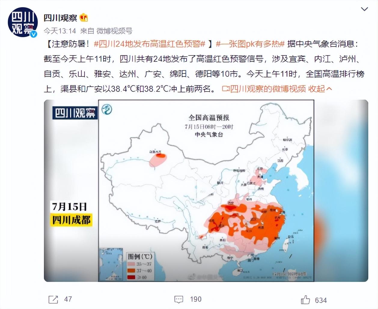 仅仅过了几天时间,四川部分地区的气温再创新高,四川泸州的气温突破41℃,其中古蔺县的气温甚至高达41.8℃。