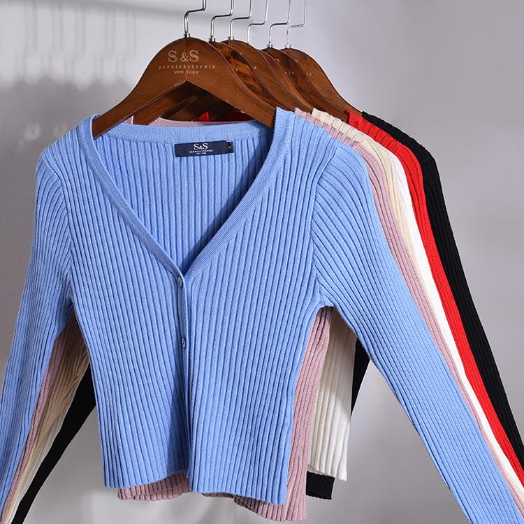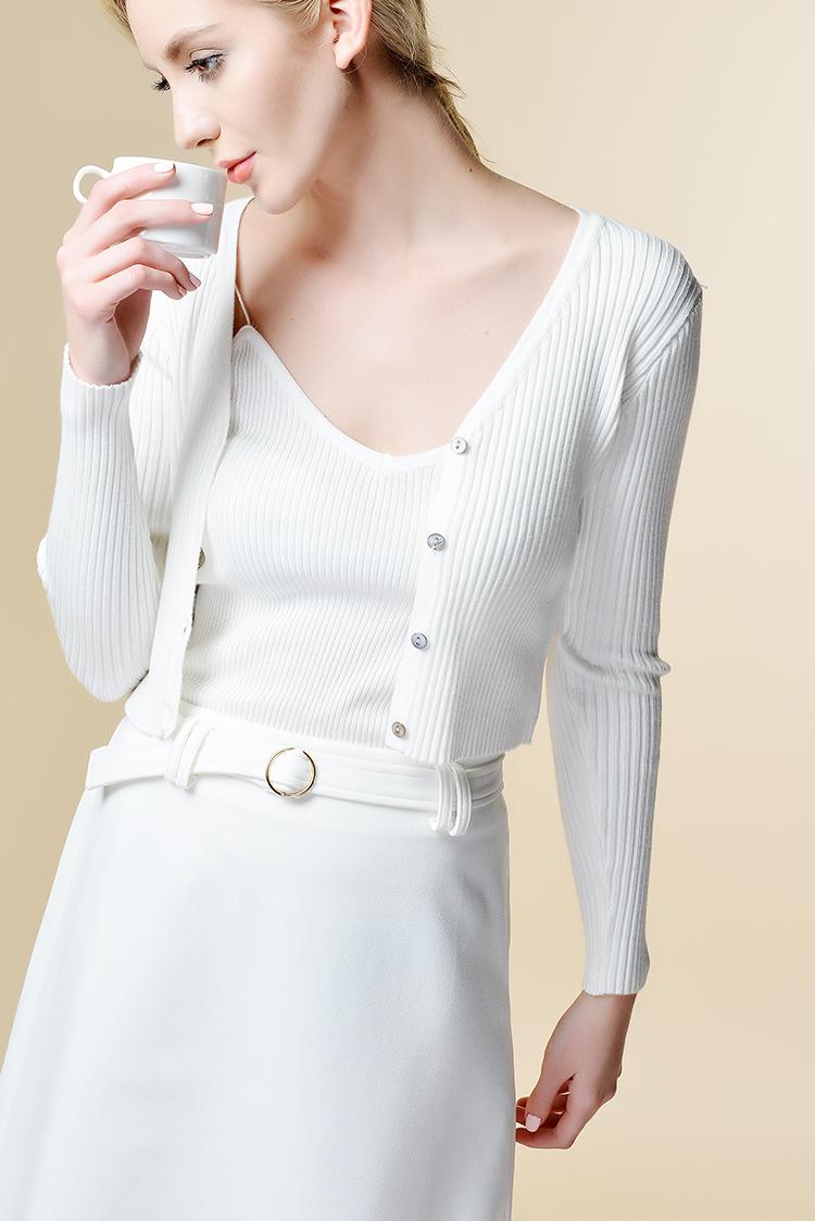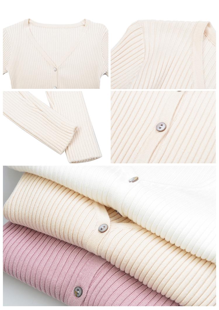 此款针织衫,小V领的款式,让小脸看起来更加的精致,竖向螺纹坑条设计修饰身形,短款版型露出内搭背心吊带,完全不用担心遮住你想要展现的美。多色可选,满足你百变的需求,适宜防晒打底,早晚出门或空调房均可穿着。
