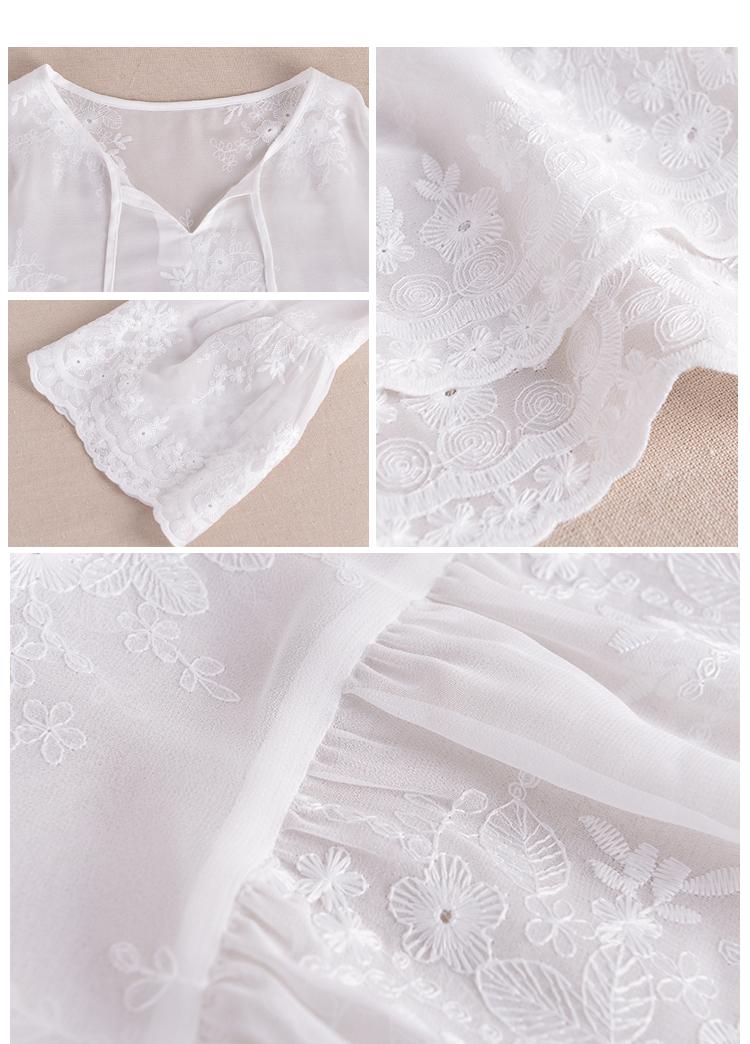 小V领系带文艺气质,精致的钩花设计和喇叭袖结合,起到了很好的减龄果,内赠亲肤小吊带,若隐若现的透视感又带有一丝小性感,美丽的同时还能防晒,多好!
