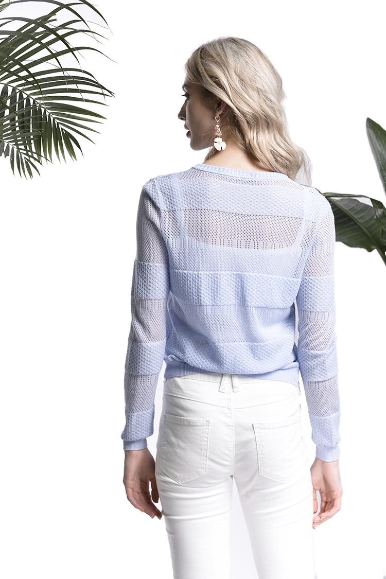 这款针织衫用不同薄厚及镂空设计来增加整件衣服的层次感,让看起来普通的针织衫不再单调无趣,上面的不同通透感的镂空设计耐人寻味也透出一丝的性感。