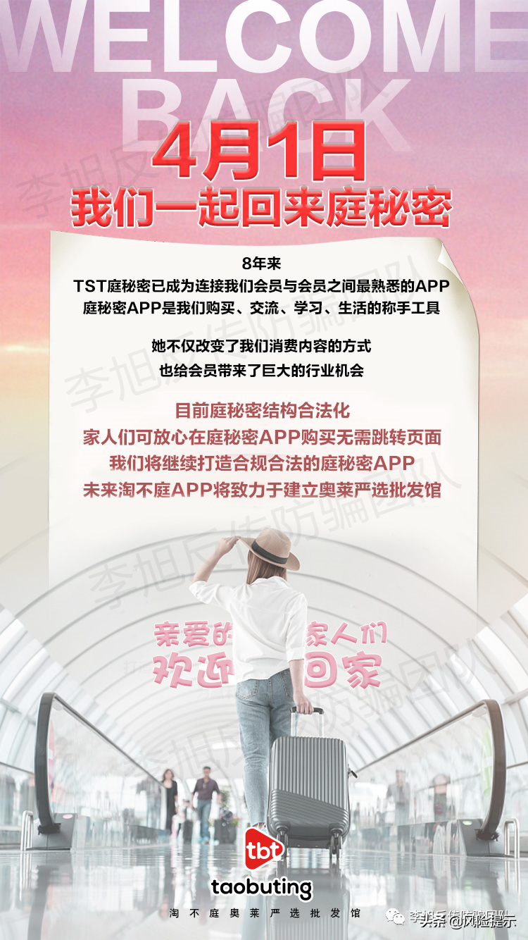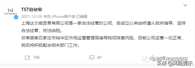 TST庭秘密在微博连夜发文否认称,上海达尔威贸易有限公司是一家合法经营的公司,自成立以来始终遵从政府指导,坚持依法经营,依法纳税。并表示感谢石家庄裕华区市场监督管理局指导排查风险,会积极配合相关工作。