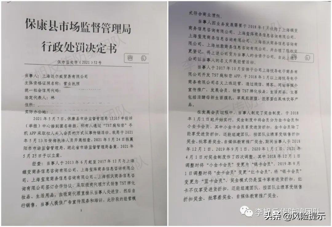 近日,李旭反传防骗团队再次接到知情人士透露,其实在2021年9月,“TST庭秘密”就因涉嫌传销被保康县市场监督管理局行政处罚过,立案信息在企查查依旧显示。