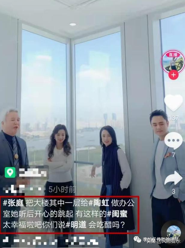 2020年10月,多名网友爆料,张庭带着陶虹和演员明道参观自己斥资17亿购入的、位于黄浦江边的新大楼。有消息称,张庭给陶虹一层楼做办公室。