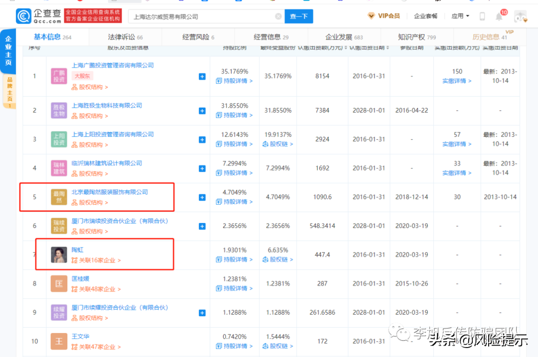 此外,除了退股的传媒有限公司,陶虹在上海达尔威贸易有限公司还留了1.93%的股份,北京陶然服装服饰有限公司也持有4.7049%股份