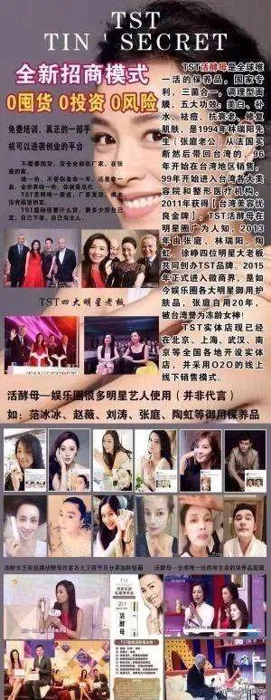 开创TST之后,张庭夫妇十分精明,充分利用明星应,请了一大帮明星为他们宣传打开市场。其中包括小陶虹、徐峥、林志玲、明道、曹格、胡海泉等在内的数十位知名明星艺人。其中小陶虹更是他们公司的股东之一。