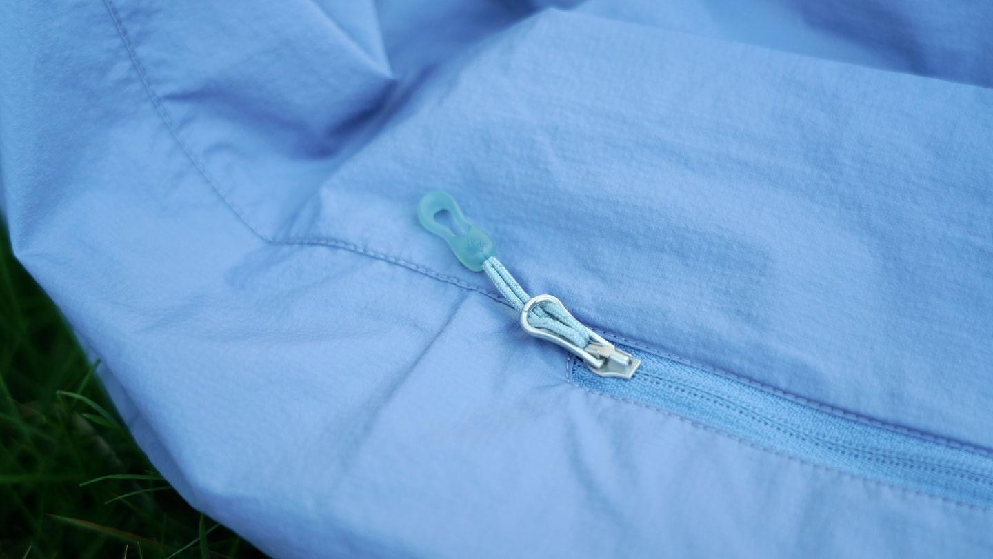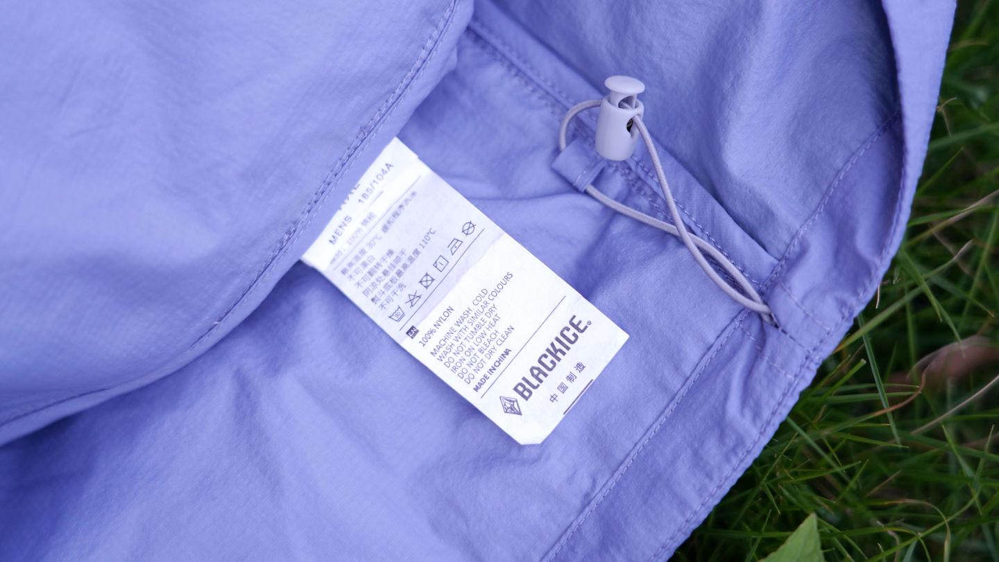 具有弹性,可通过抽绳调节的下摆好用,在不同的光线下,这款防晒衣的湖蓝色有时候还会呈现出一点点偏紫色,也挺好看。