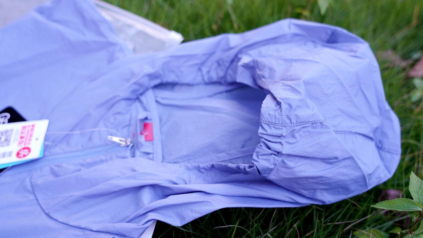 自带可收纳的小袋子,可以快速折叠把衣服塞到收纳包里头,拿在手上盈盈一握。不过如果能设计成和其他皮肤衣一样的把收纳袋和衣服的侧边口袋连在一起的话会更省心。
