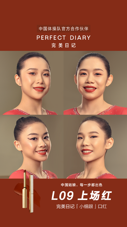 近,又有国产品牌高调“入伙”,中国新时尚美妆品牌日记正式成为中国体操队官方合作伙伴,携手中国女子体操队的姑娘们一起推出口红新色“L09 上场红”,鼓励更多的女性不受外界标签束缚,努力突破自我,为自信力加持,演绎“出场即出色”。