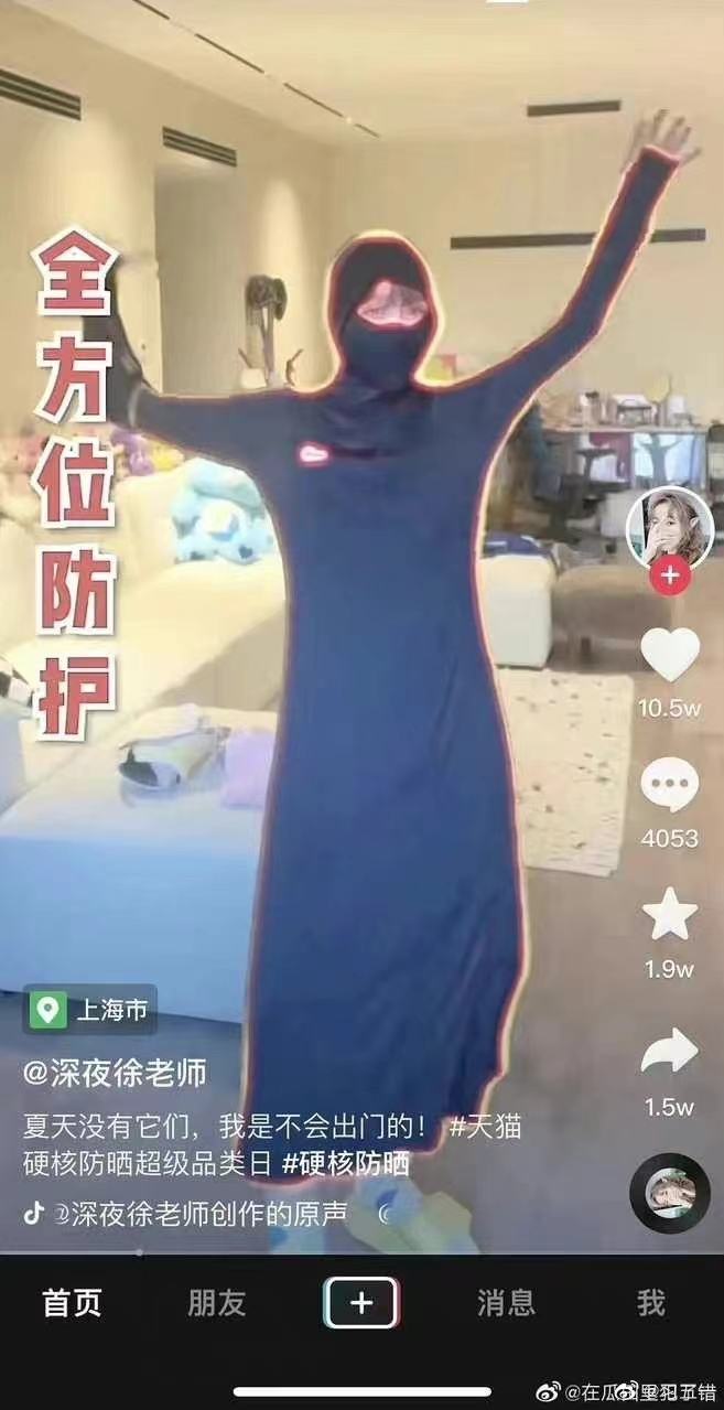 微博网红“喵子”发了一张自己穿着黑色长袍的防晒照片,全身上下被遮盖得严严实实,连眼睛都看不到。这张照片突然爆红,即使她后来把照片删了,依然被网友截图转发。在她的微博下集合了众多“防晒人”的晒图,可以领略到一个“合格防晒人出门的必备素养”究竟是何种模样。