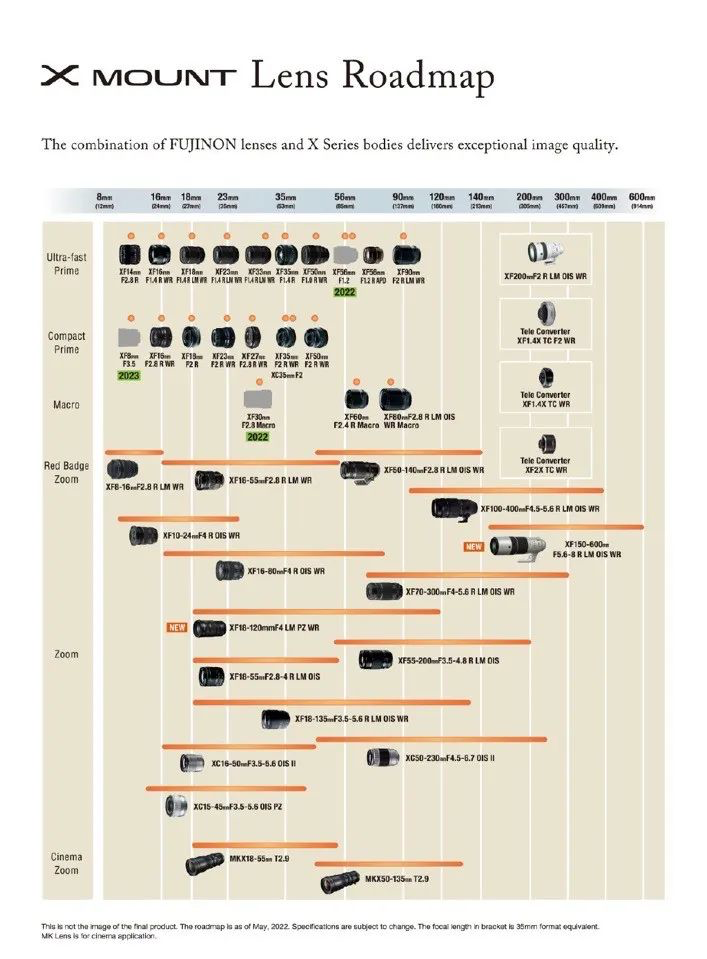 中画幅镜头群方面,今年富士确认了移轴镜头将会有两支,分别是针对建筑/风光摄影的30mm F5.6与针对微距/静物摄影的110mm F5.6。之前预告过的55mm F1.7也没有在2022年正式发布,估计2023年也会正式登场吧。