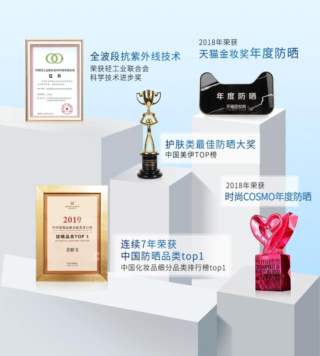 从2001年推出第一支防晒开始,美肤宝就精专防晒领域,不断自主创新。美肤宝打造差异化产品策略,推出以防晒、美白、隔离多合一为卖点的防晒产品,成功将之打造为明星爆品。