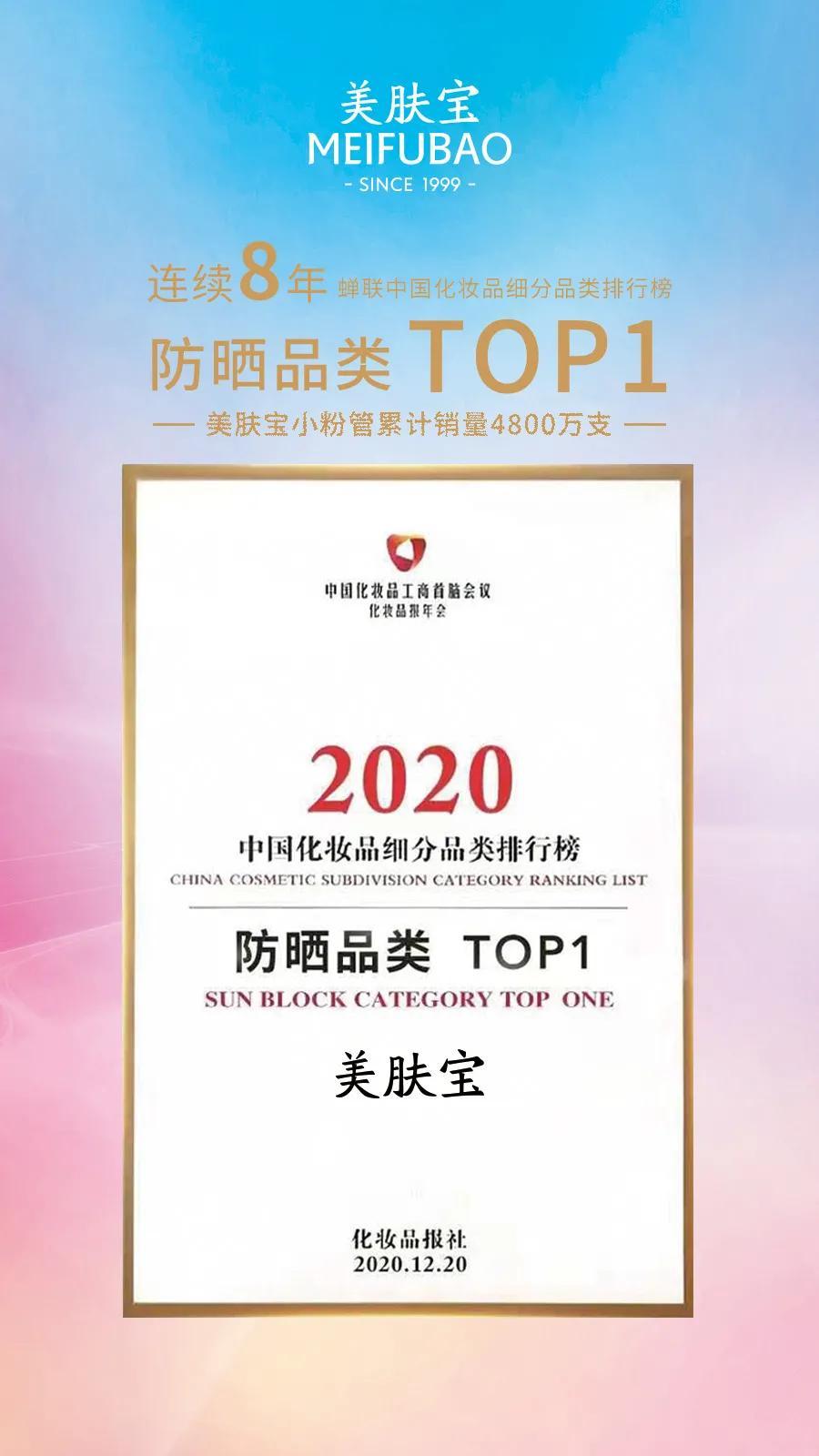 12月21日,中国化妆品工商首脑会议暨2020化妆品报年会在武汉隆重举行。当晚,美肤宝蝉联2020年中国化妆品品牌榜暨细分品类三甲排行榜防晒品类TOP1大奖。值得一提的是,美肤宝成为连续8年获得该奖项的品牌。