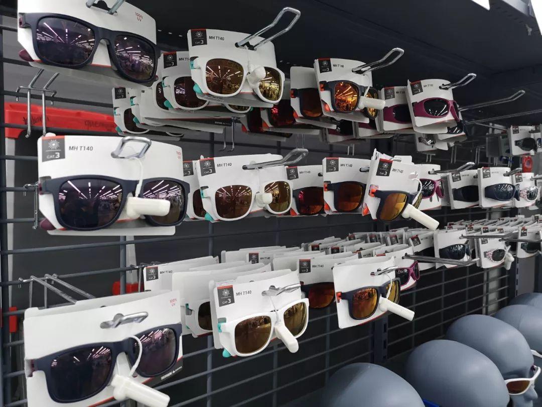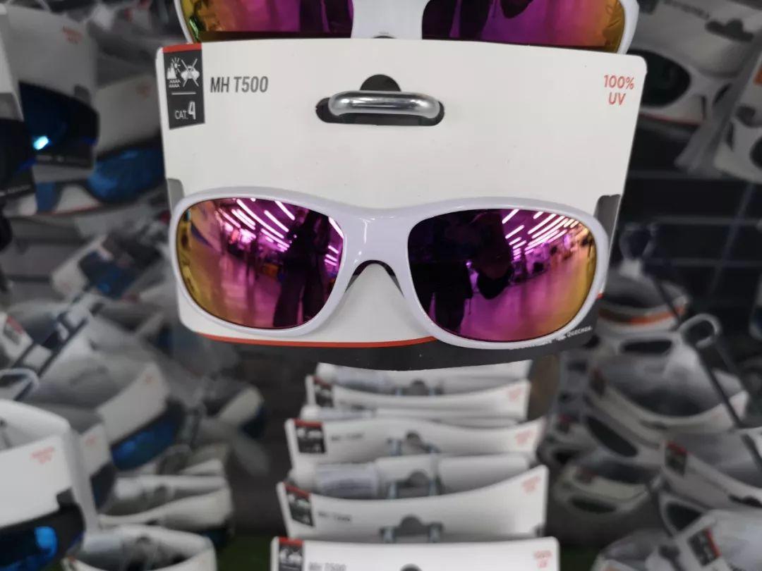 迪卡侬的儿童太阳镜款式分类较多,镜片类别主要为3、4类,目测也是线下售卖4类镜片的。据我们观察,成都迪卡侬专柜摆放的儿童太阳镜也都没有贴UV400标识,但标签上有UV标识。迪卡侬对儿童使用年龄和眼镜大小分类较细,镜片材质均为聚碳酸酯,有抗冲击性,镜架都较柔软。