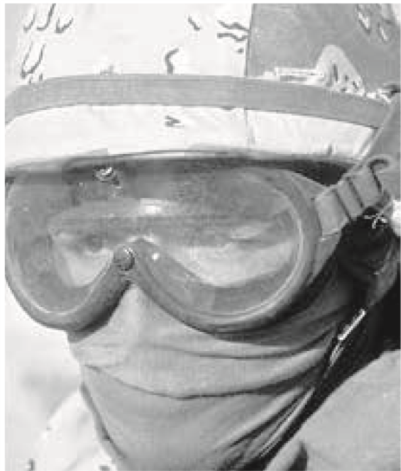 上图:沙漠服装必须 将全身都包裹起来以防止晒伤,士兵同 时还需要有抵御沙尘的保护。