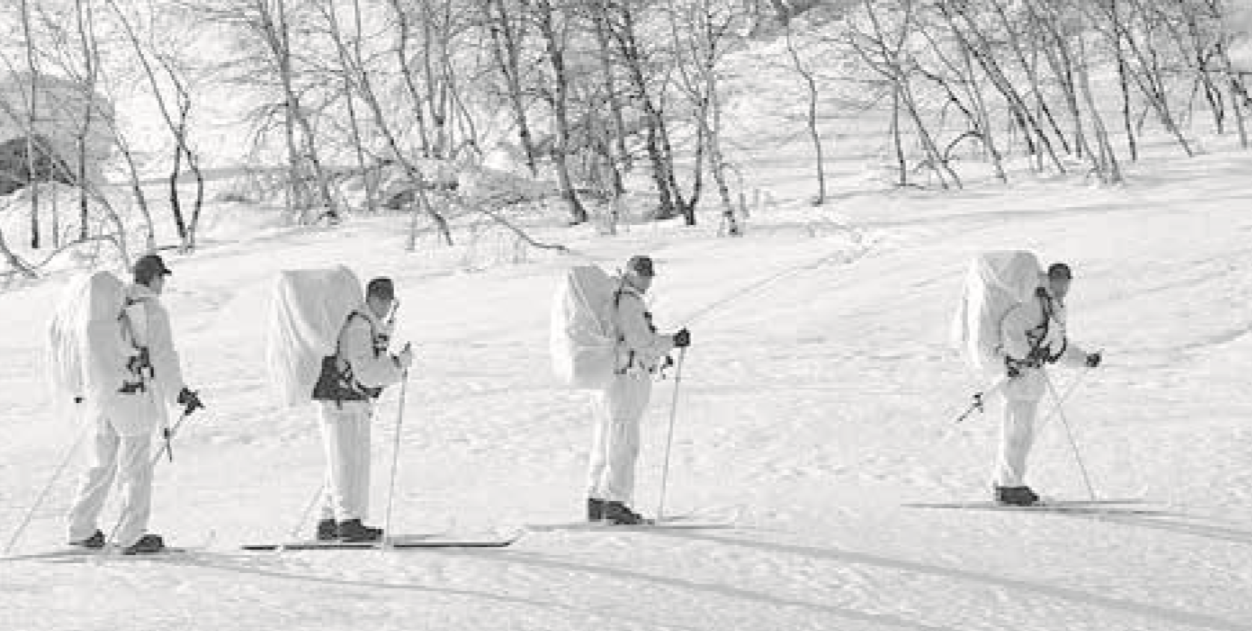 上图:对于四人侦察小组来说,在极地气候下执行 任务时,服装必须能够抵抗寒冷、潮湿和强风。
