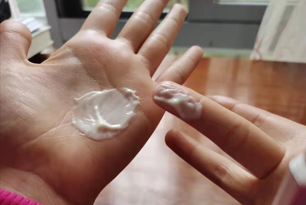 绿管挤出来是黄色的膏体,用手抹开铺平后,居然有种豆腐渣的感觉