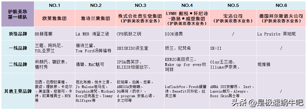先来看看各个耳熟能详的护肤美妆品牌它们的品牌归属以及所处等级。