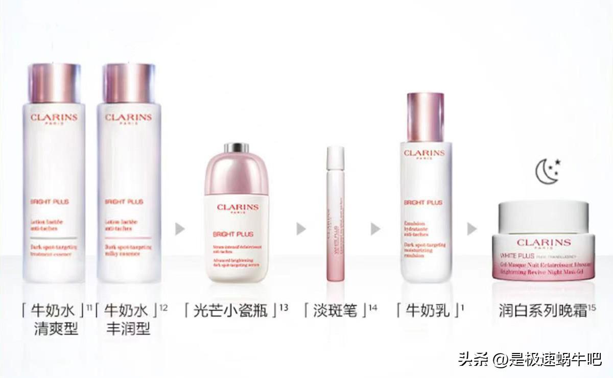 “透亮焕白淡斑柔肤液(牛奶水),透亮焕白淡斑匀净精华,透亮焕白淡斑乳液,清透润白淡斑晚安霜,”可以组成娇韵诗牛奶焕白系列,全套售价在2380元~2630元。