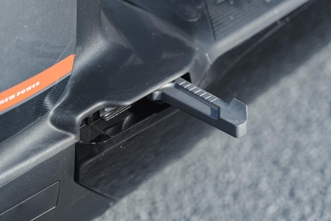 驾驶座前360mm的大档距,腿部空间很大,放脚的踏板,角度也更舒服,在实际骑行中友好不少,特别是长期驾驶,大空间能让舒适性加倍。