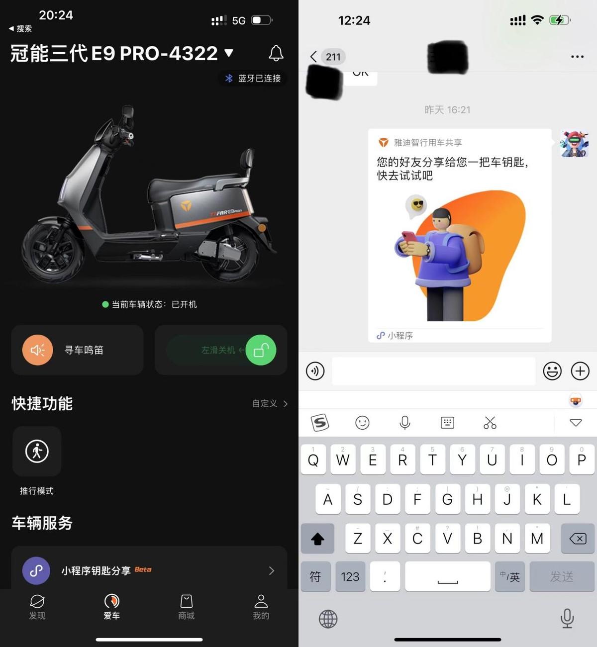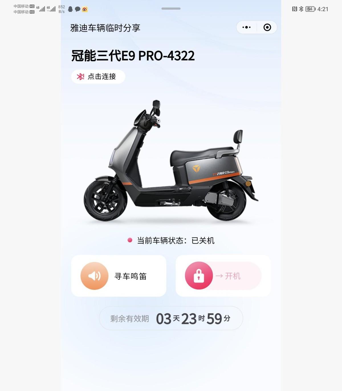 作为雅迪冠能系列的明星产品,智能化也是不容小觑,人车智慧互联、手机解锁、寻车鸣笛、离车休眠……这些都是基本操作,也可以对一键开机,定时关机时间,车辆灵敏度等进行设置。更重要的是,还可以通过小程序解锁,把钥匙通过小程序分享给你的家人朋友,不用给别人物理钥匙,也不用费事下载APP,这个功能必须要好评。