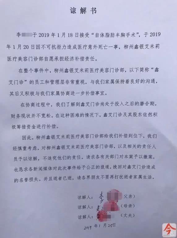据鑫艾门诊提供的死者家属签字的《谅解书》显示:李女士于1月18日接受“自体脂肪丰胸手术”,于1月20日因不可抗拒力造成医疗意外死亡一事,鑫银门诊自愿承担经济补偿责任。