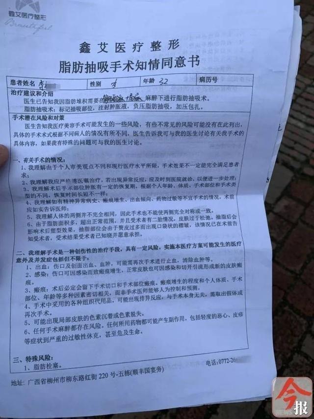 在家属提供的一份《鑫艾医疗整形脂肪抽吸术同意书》上,注明了相关的风险事项,不过确实没有家属的签名。