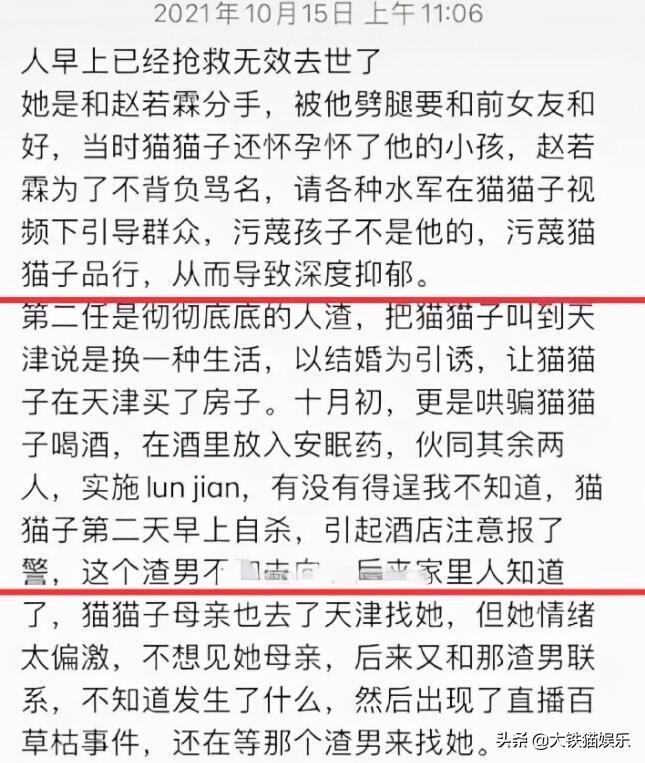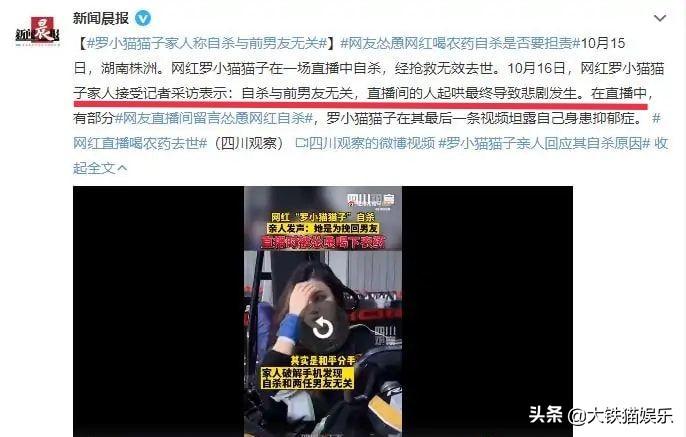 频繁遇人不淑,多重打击之下猫猫子的精神世界坍塌了。直播时,水军的怂恿成了压垮她的后一根稻草。
