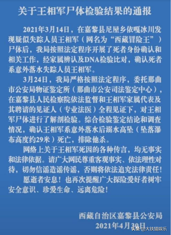 2020年12月20日,王相军在西藏那曲黎嘉县依嘎冰川发生落水意外并失踪。之后关于他是生是死一直被大家密切地关注着。