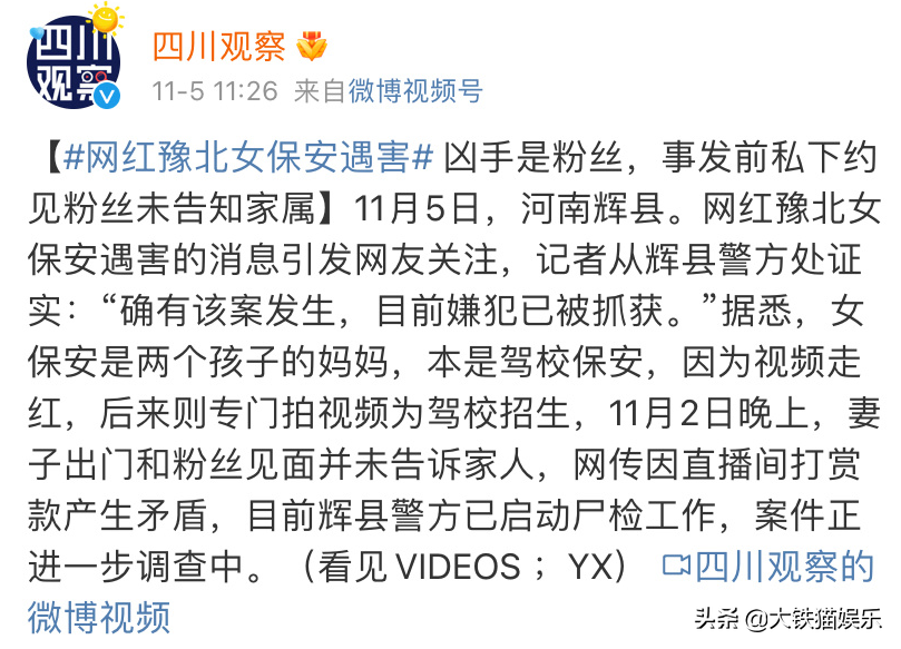 2021年11月2日,“豫北女保安”遇害,凶手是她直播间里的“榜一大哥”,40多岁,离异带着孩子。该男子前后为她刷了十几万礼物以博得她的关注,被拒绝后要求退钱。